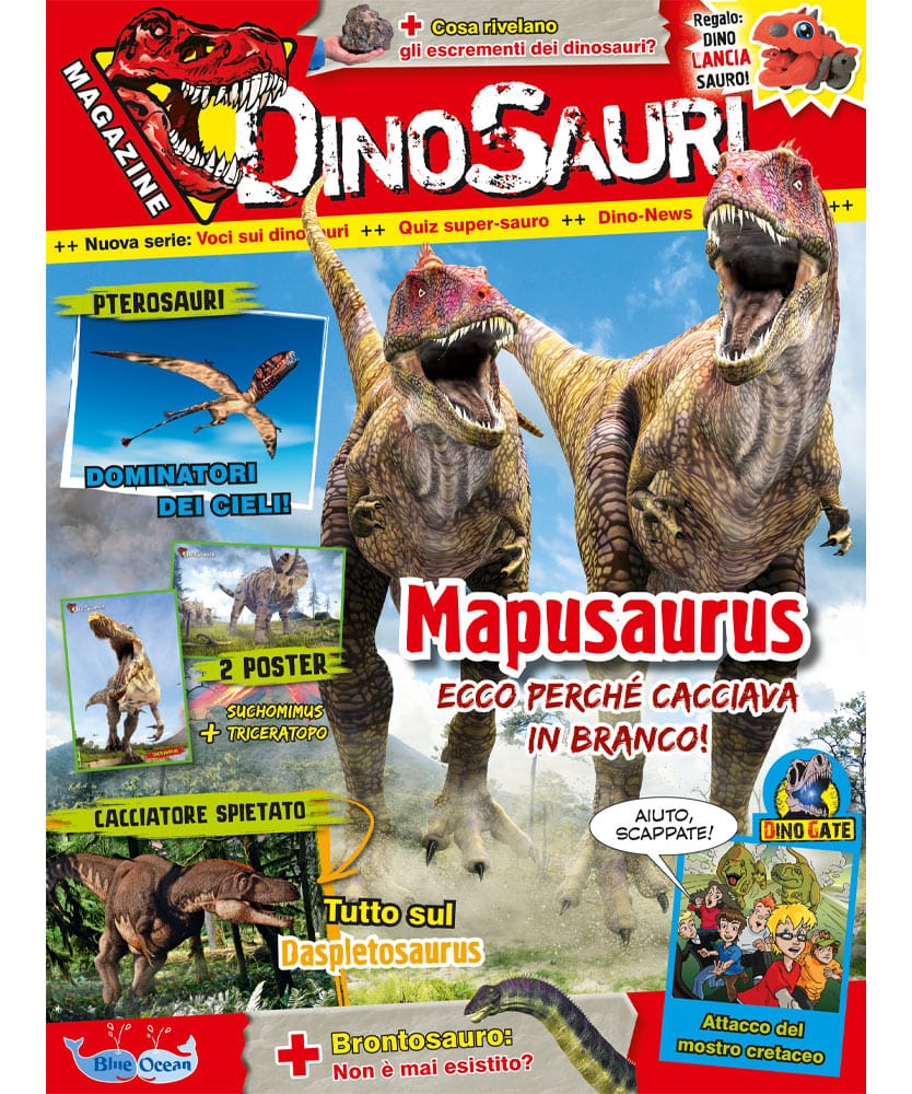 In questo numero ogni pagina ti farà fare un salto indietro nel tempo e vivere un’avventura emozionante, grazie a 2 poster: Triceratopo e le Suchomimus, tanti giochi e attività e una storia a fumetti dal Dino Gate “Attacco del mostro cretaceo!
